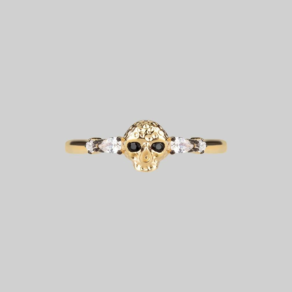A small and detailed skull head with faceted Onyx eyes sits central between two tear shaped Cubic Zirconia crystals. Inspired by Mourning Rings worn to express the sentiment of death.