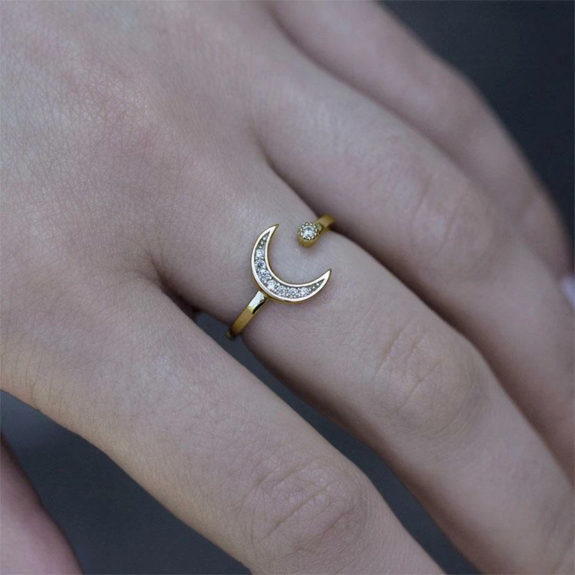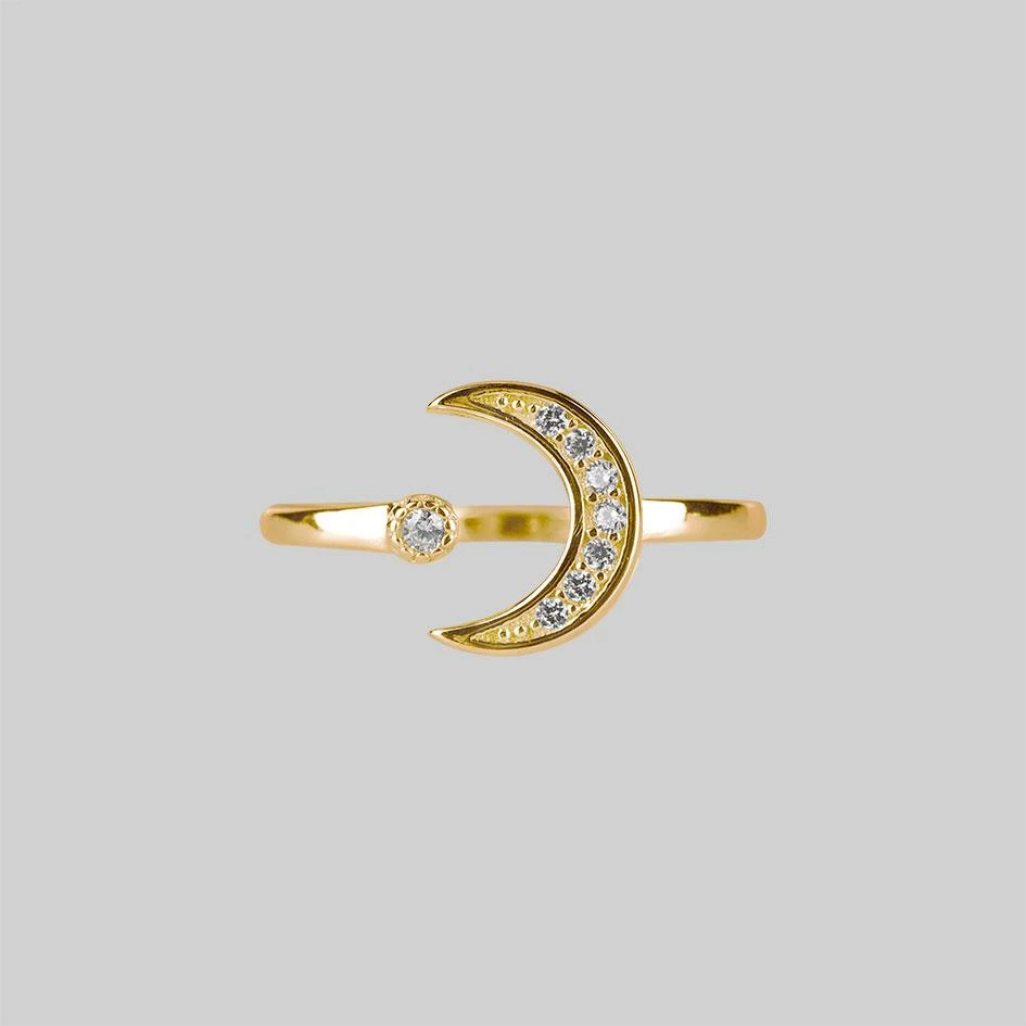 Crystal encrusted gold moon crescent and sparkling star ring.