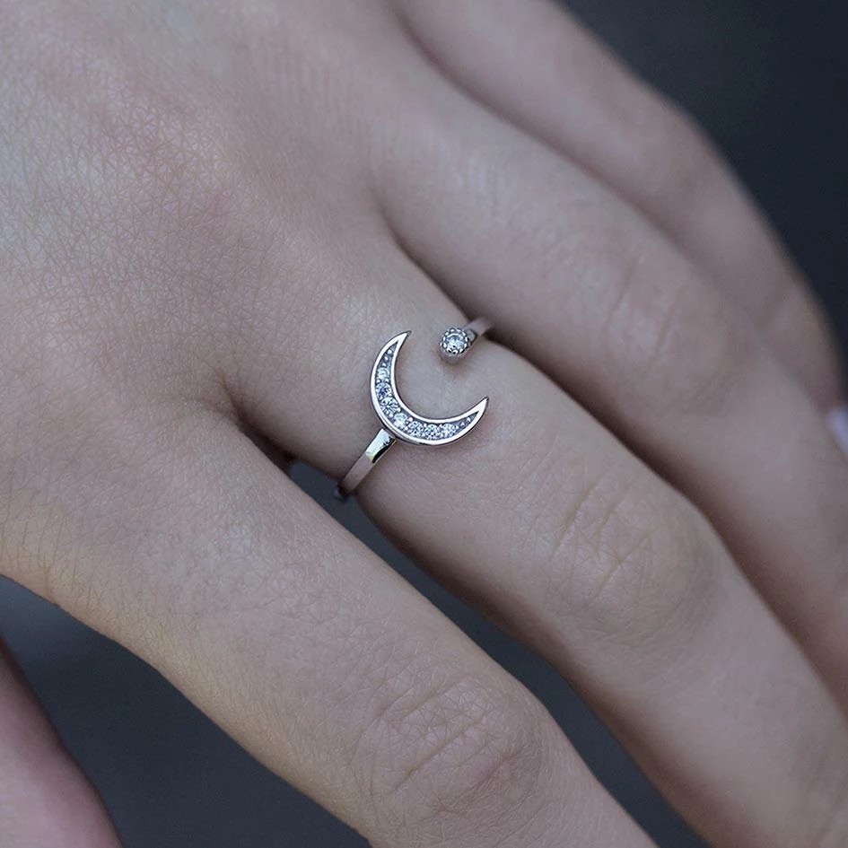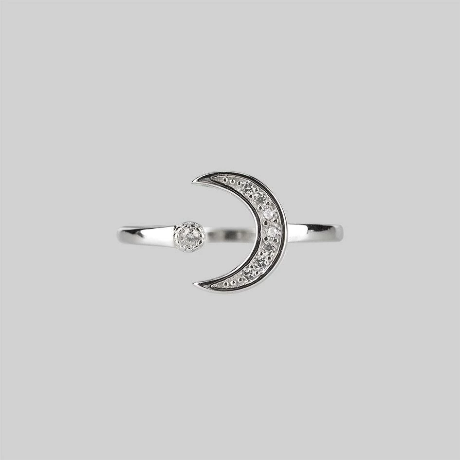 Sterling silver crystal encrusted moon crescent and sparkling star ring.