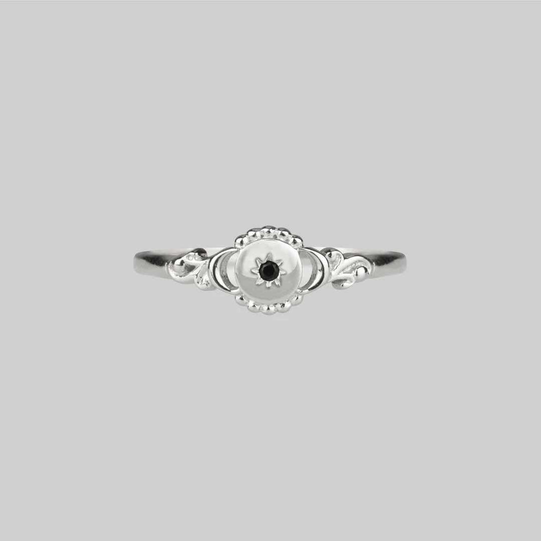 Inspired by the nights sky, celestial shapes of the sun and moon feature a tiny central Black Spinel encrusted star.
