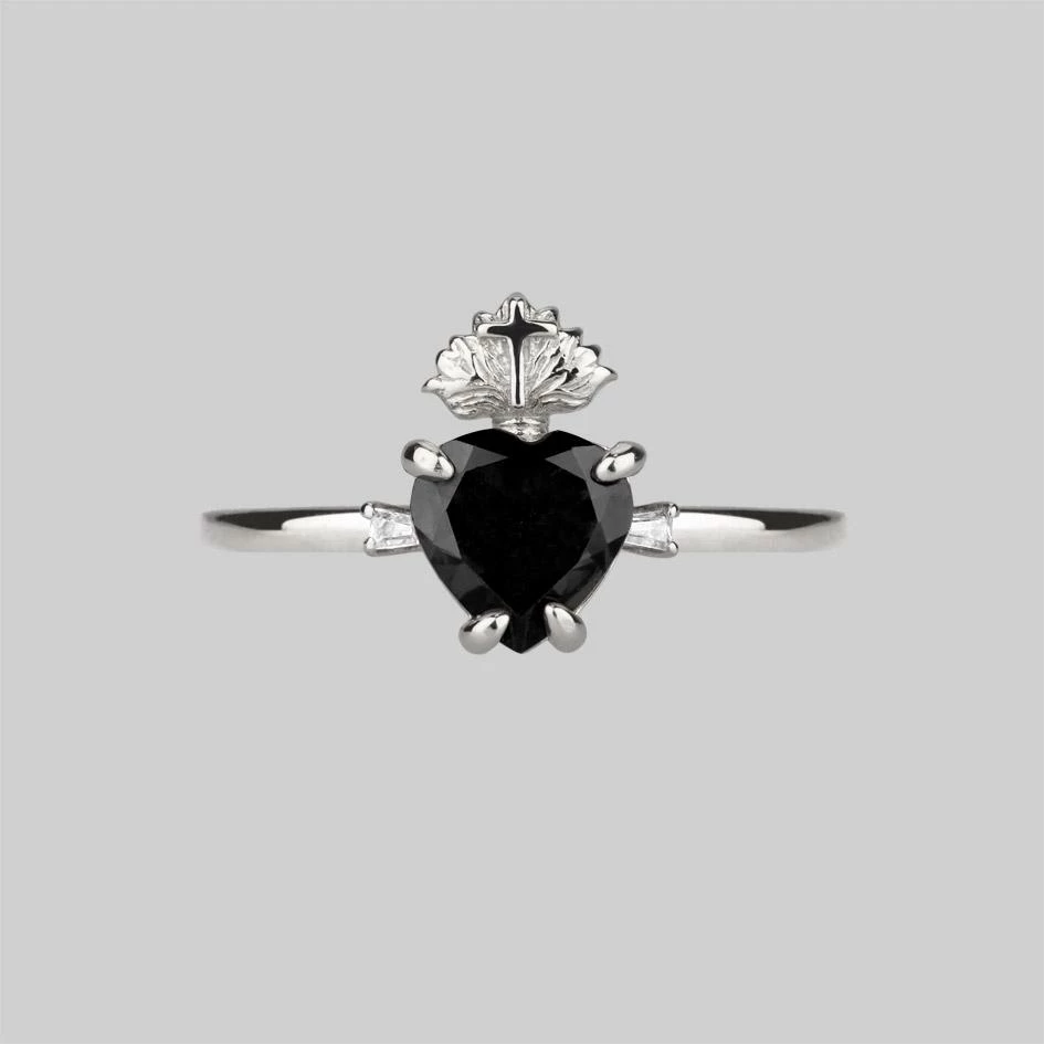 Delicate Sacred Heart ring featuring a dark Black Spinel faceted heart gemstone and two Cubic Zirconia crystals.