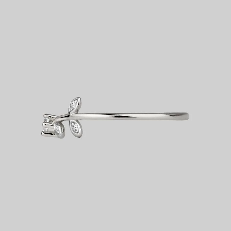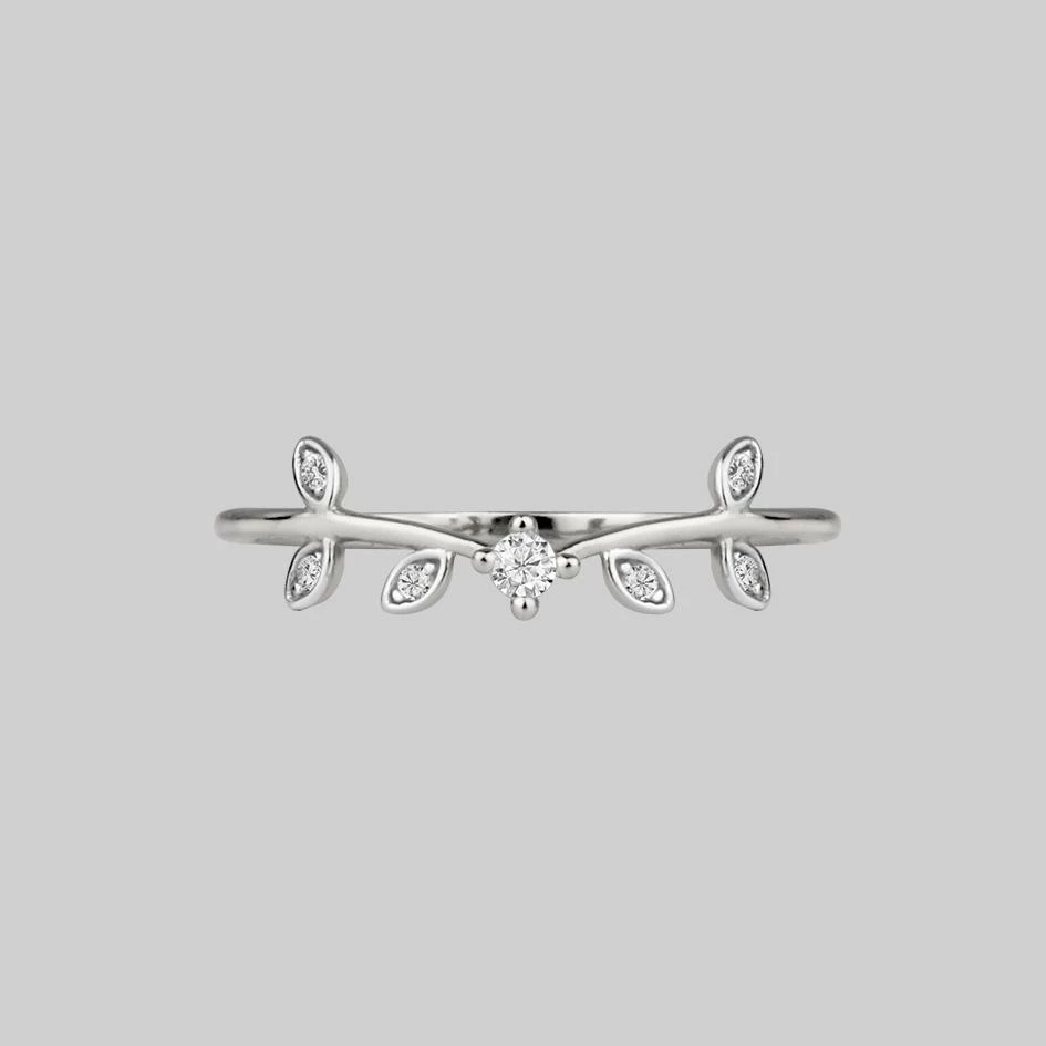 Delicate and dainty leaf ring featuring sparkling Cubic Zirconias. Ideal for stacking.