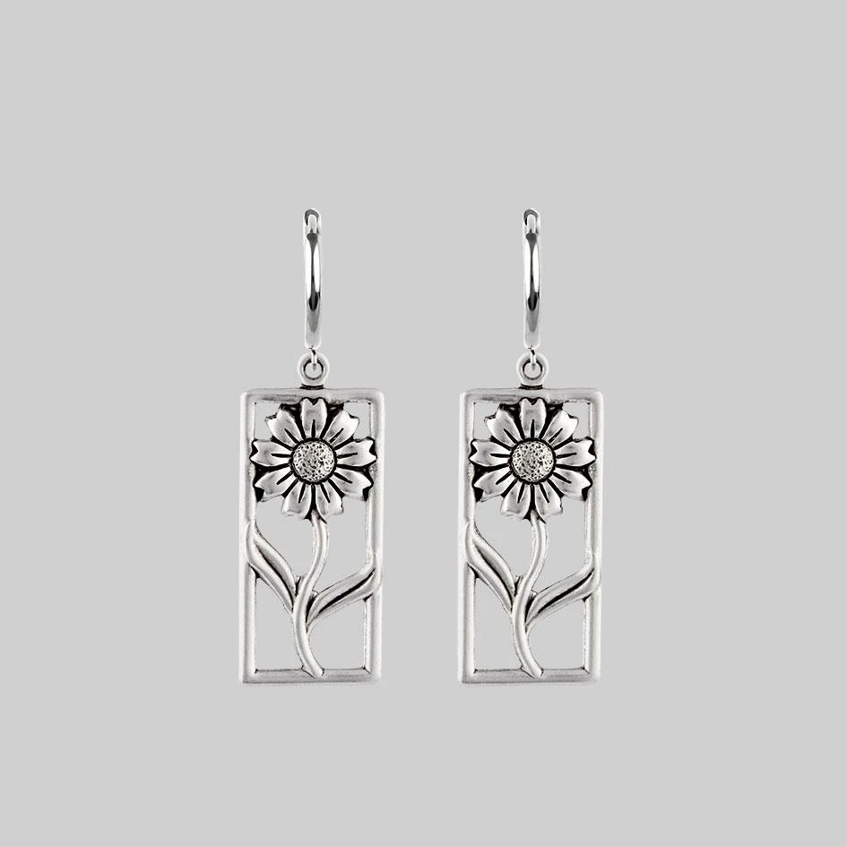 Rectangular framed sunflower hoop earrings.