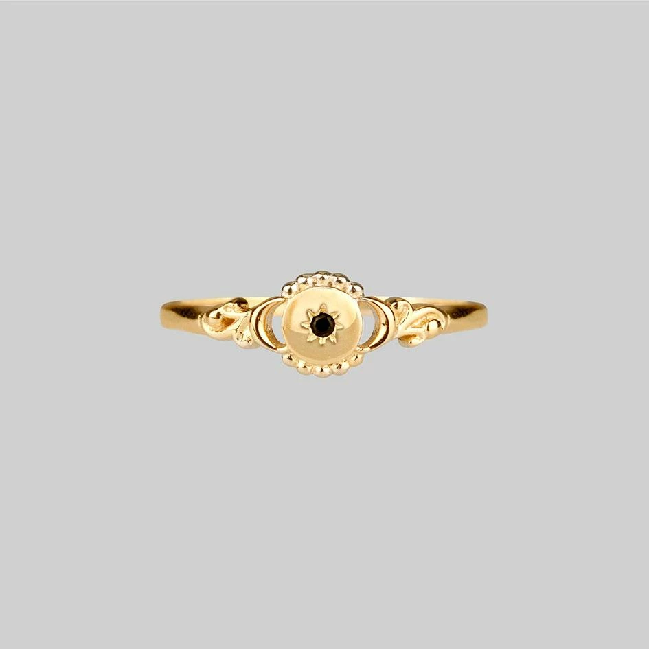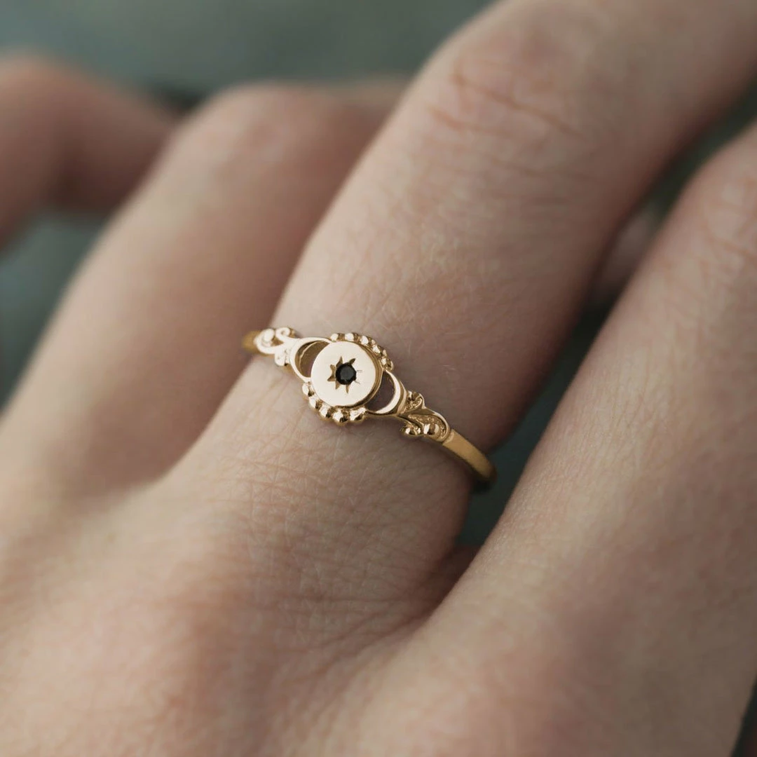 Inspired by the nights sky, celestial shapes of the sun and moon feature a tiny central Black Spinel encrusted star.