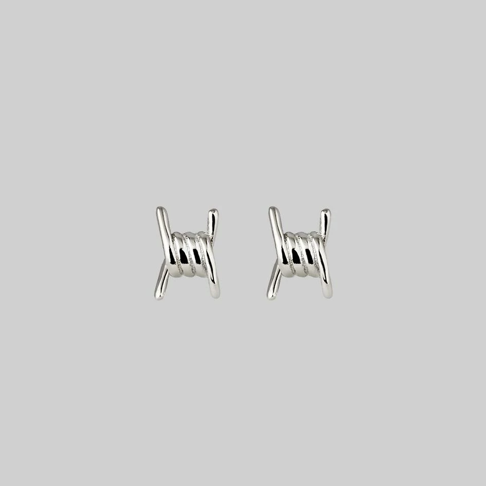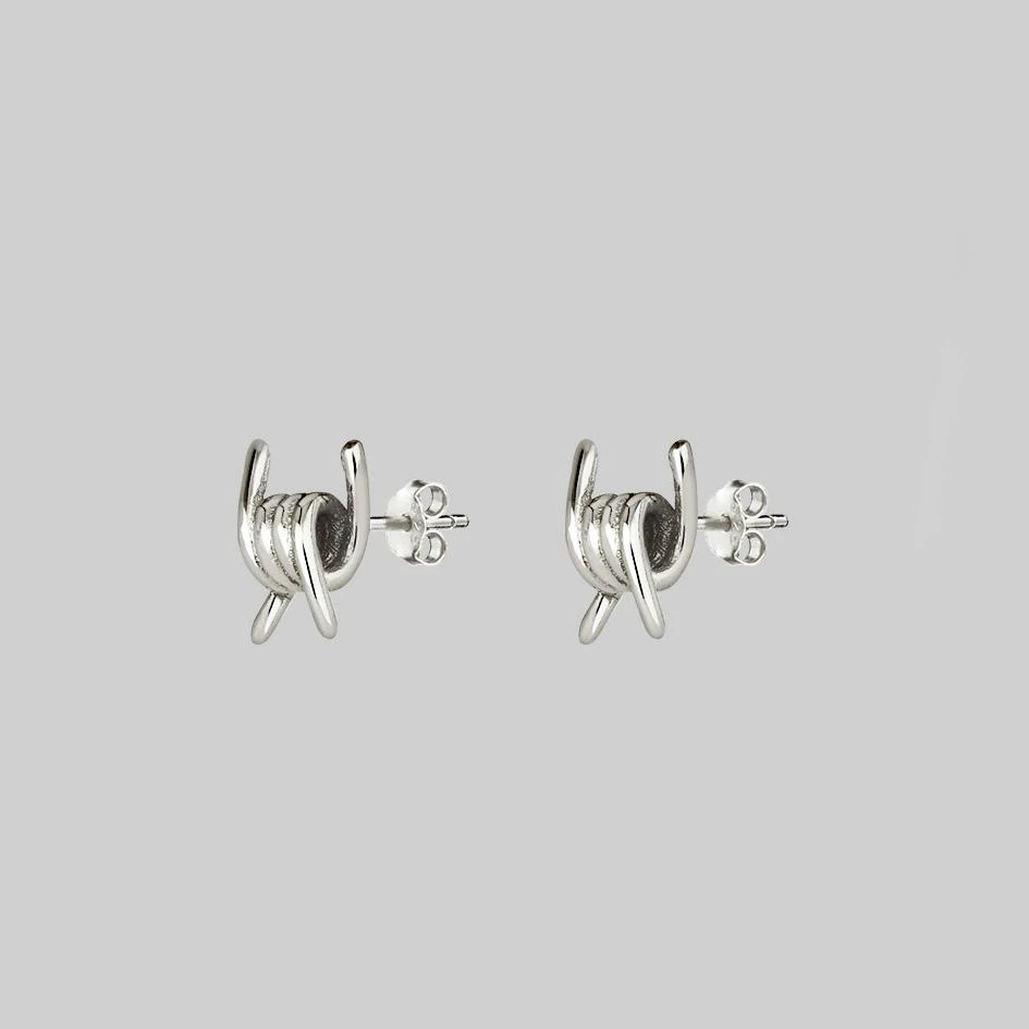 Elegant and deadly. Silver barbed wire knot stud earrings.