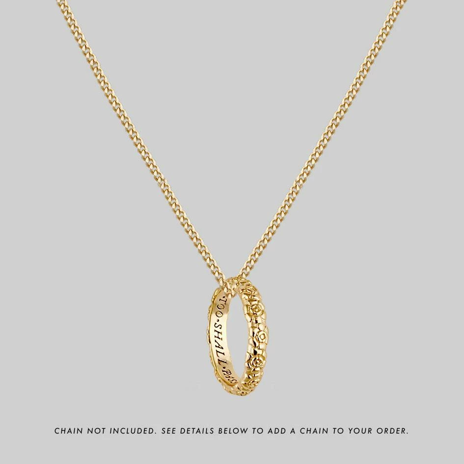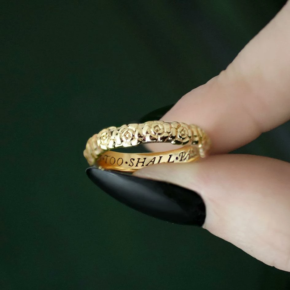 Gold ring featuring ornate floral Rose detail. Inside, features the words This Too Shall Pass inscribed in an old English gothic font.