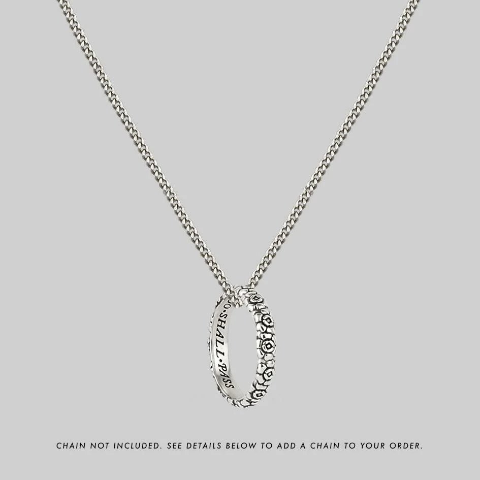 Silver ring featuring ornate floral Rose detail. Inside, features the words This Too Shall Pass inscribed in an old English gothic font.Â