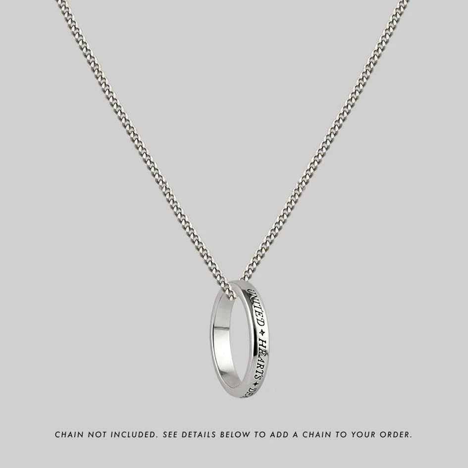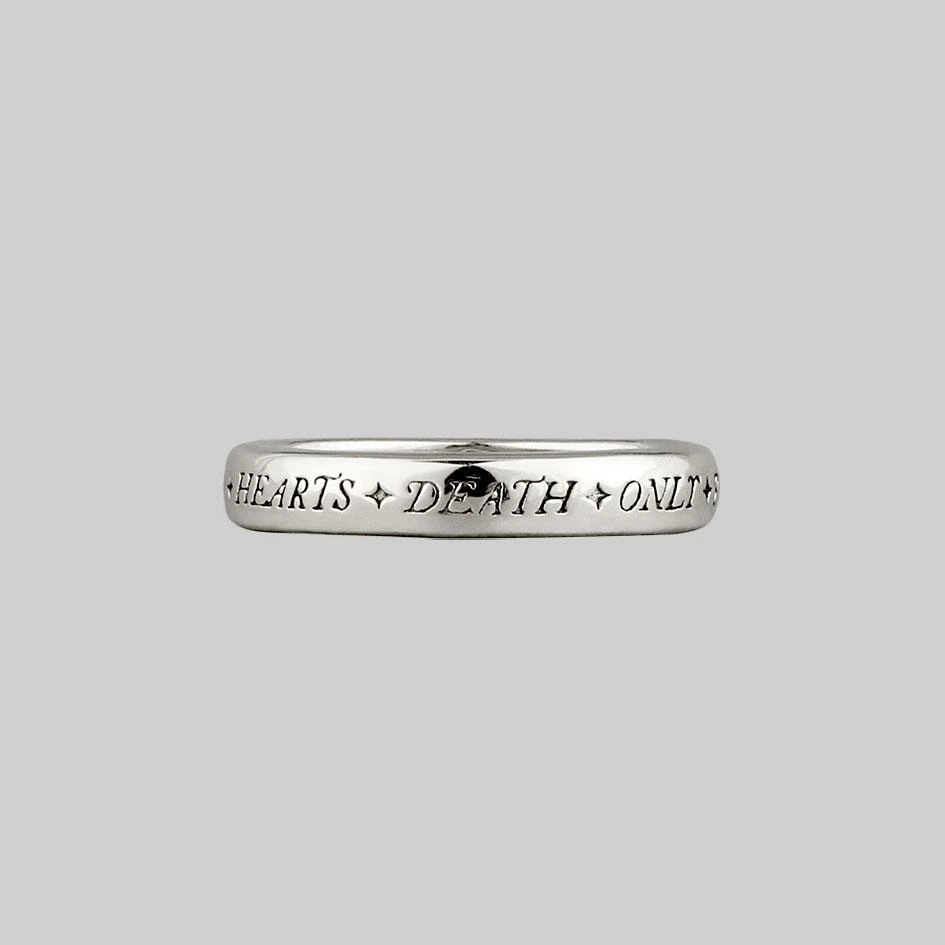 Smooth silver band ring featuring the words United Hearts Death Only Parts inscribed in an old English gothic font. Inside the ring band features a tiny Skull.