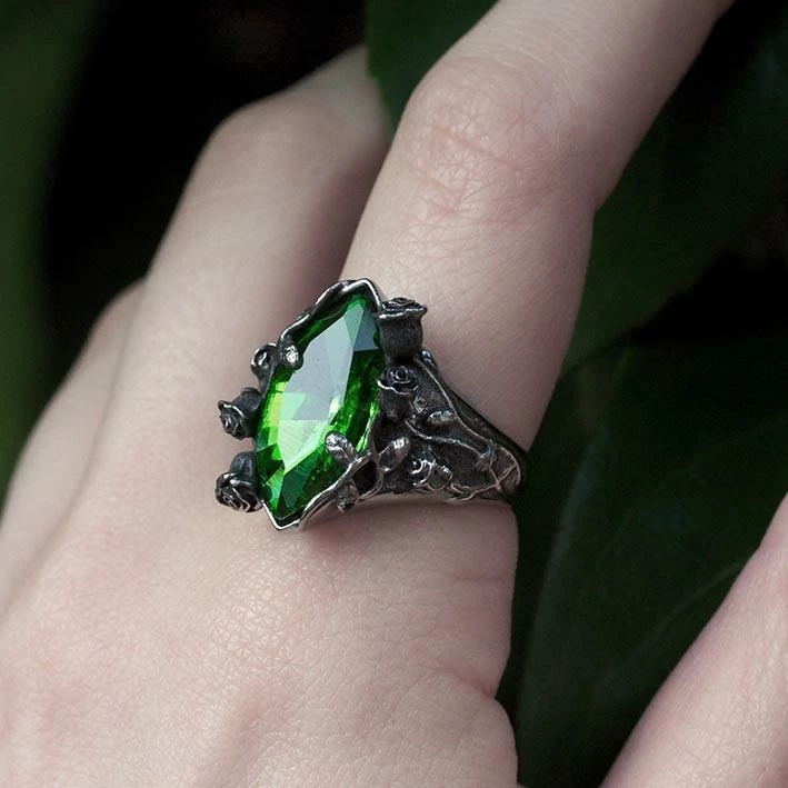 Dark enchanted foliage of rose buds and poison ivy surround a glowing green SWAROVSKI™ crystal. CAUTION: Serious glow.