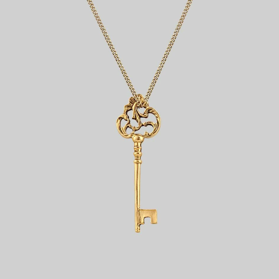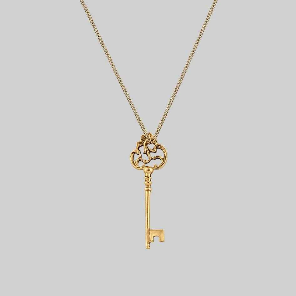Ornate darkly detailed key hangs on a delicate curb chain.
