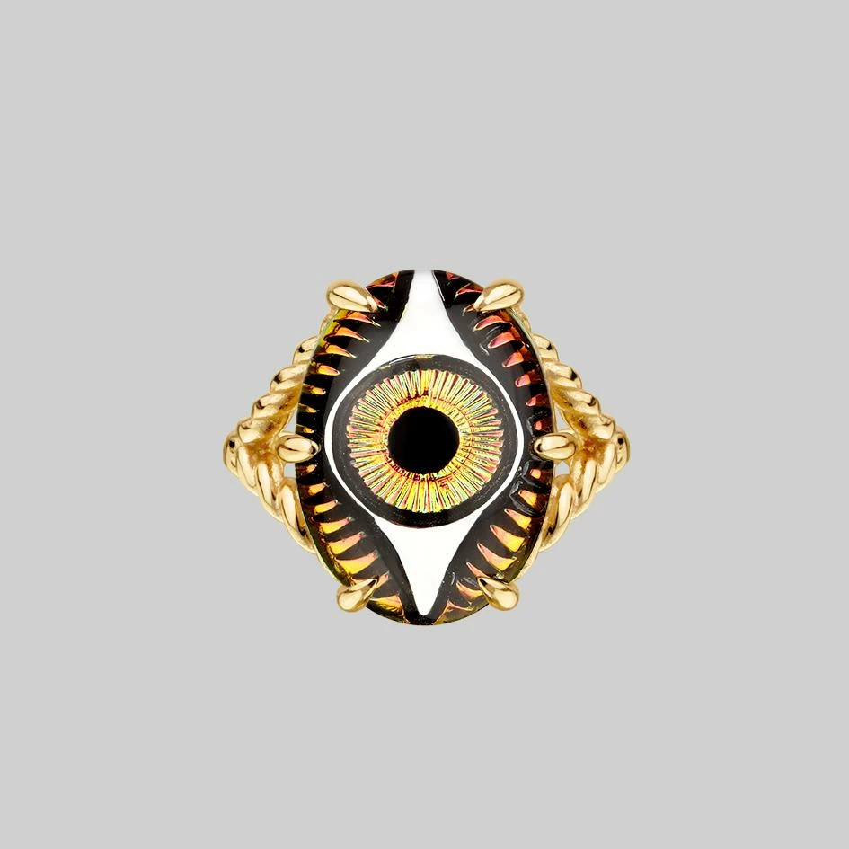 Vibrant iridescent glass eye set within claw shaped prongs sits upon a twisted style ring.