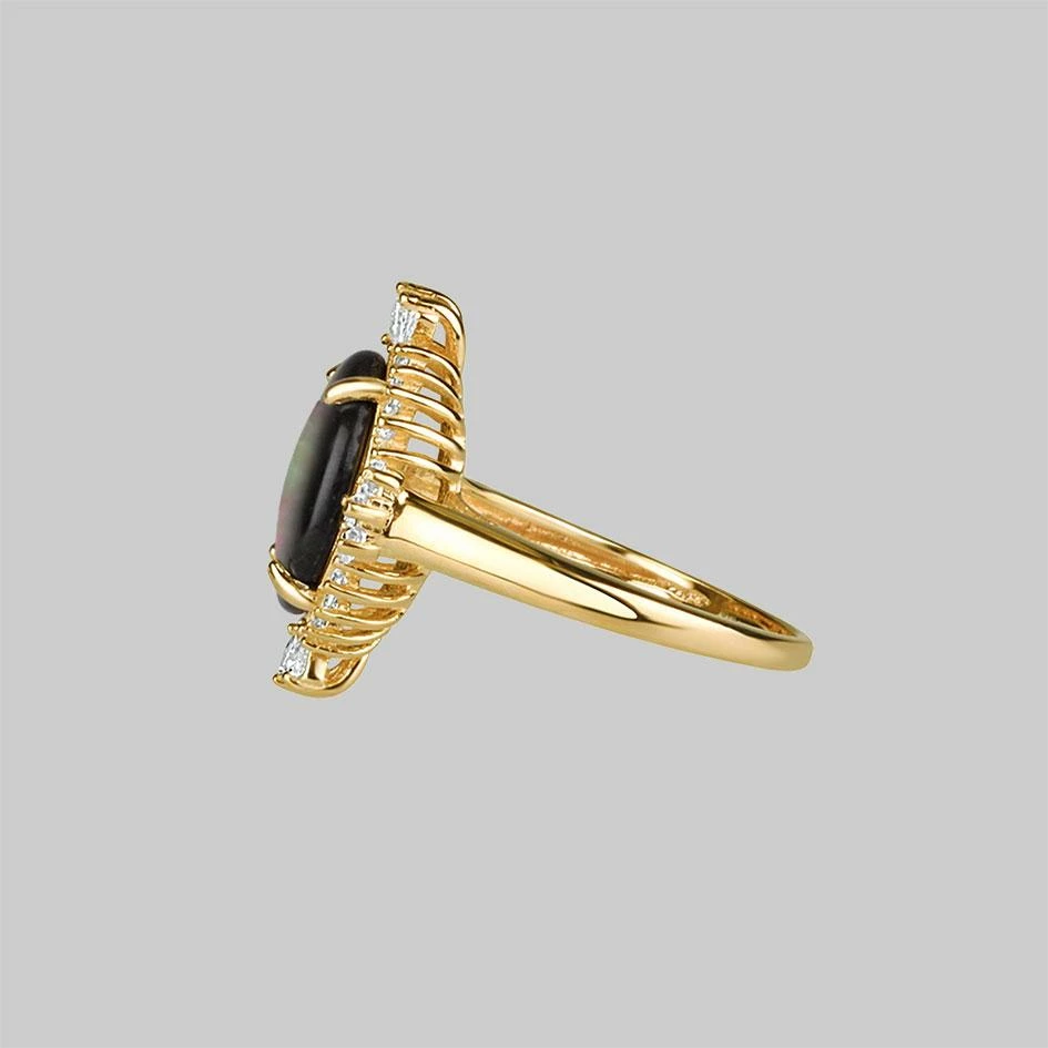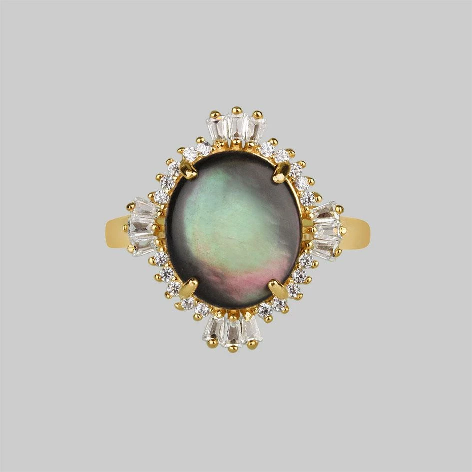 Beautiful iridescent Black Mother of Pearl set within a sparkling sunburst of tiny Cubic Zirconia crystals.