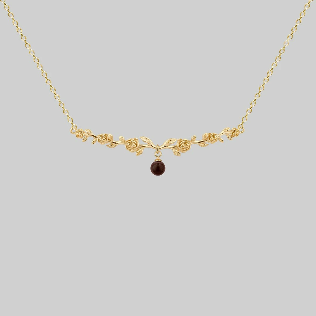 Gold collar necklace featuring detailed wild rose branches and a dark red sphere of Garnet gemstone. Designed to sit just above your collar bone.