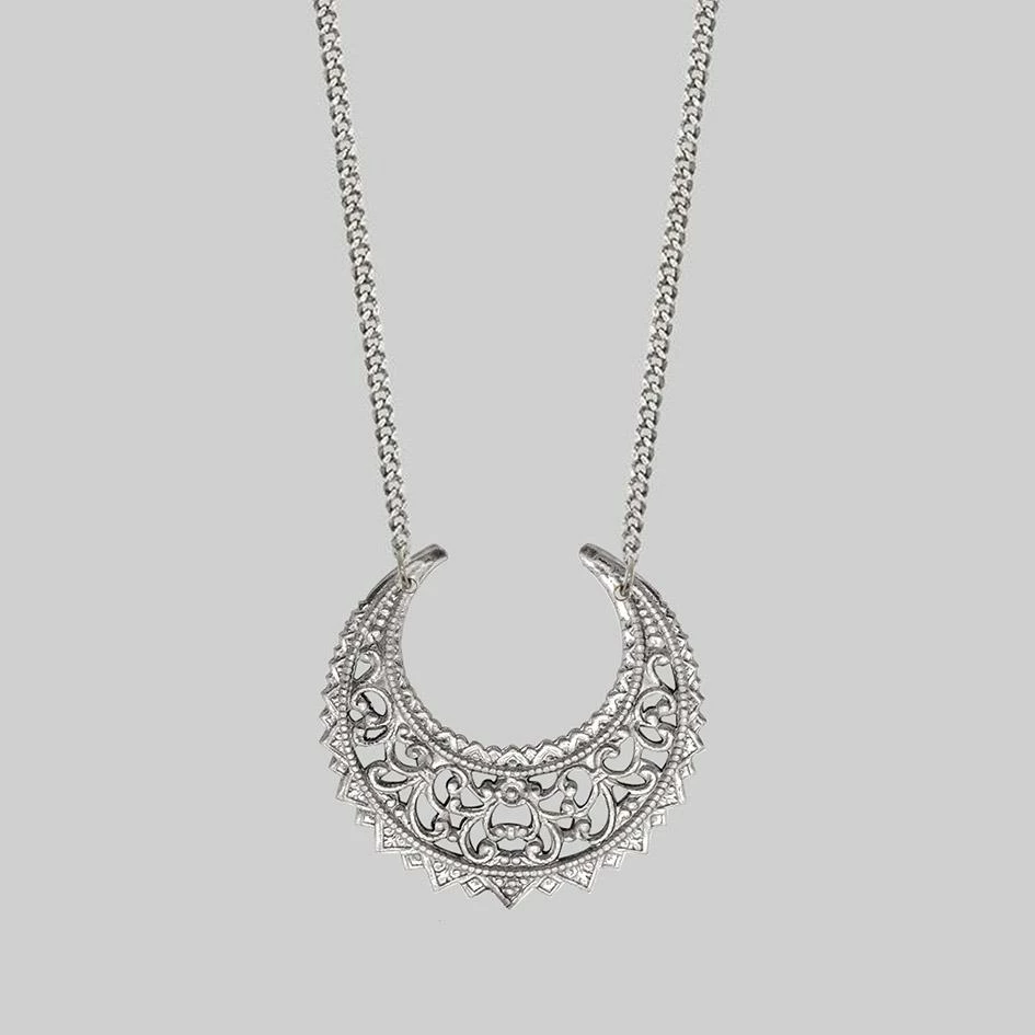 Beautifully intricate Eastern inspired crescent hangs on an adjustable chain.Â