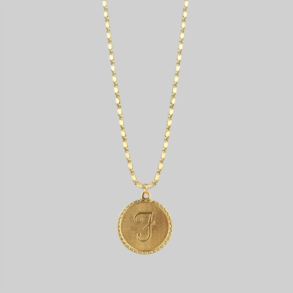 Gold medallion necklace featuring a delicate script initial and sparkling chain.