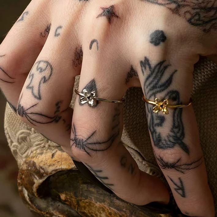 Gold ring featuring a delicate Clematis flower with a tiny Black Spinel gemstone centre.
