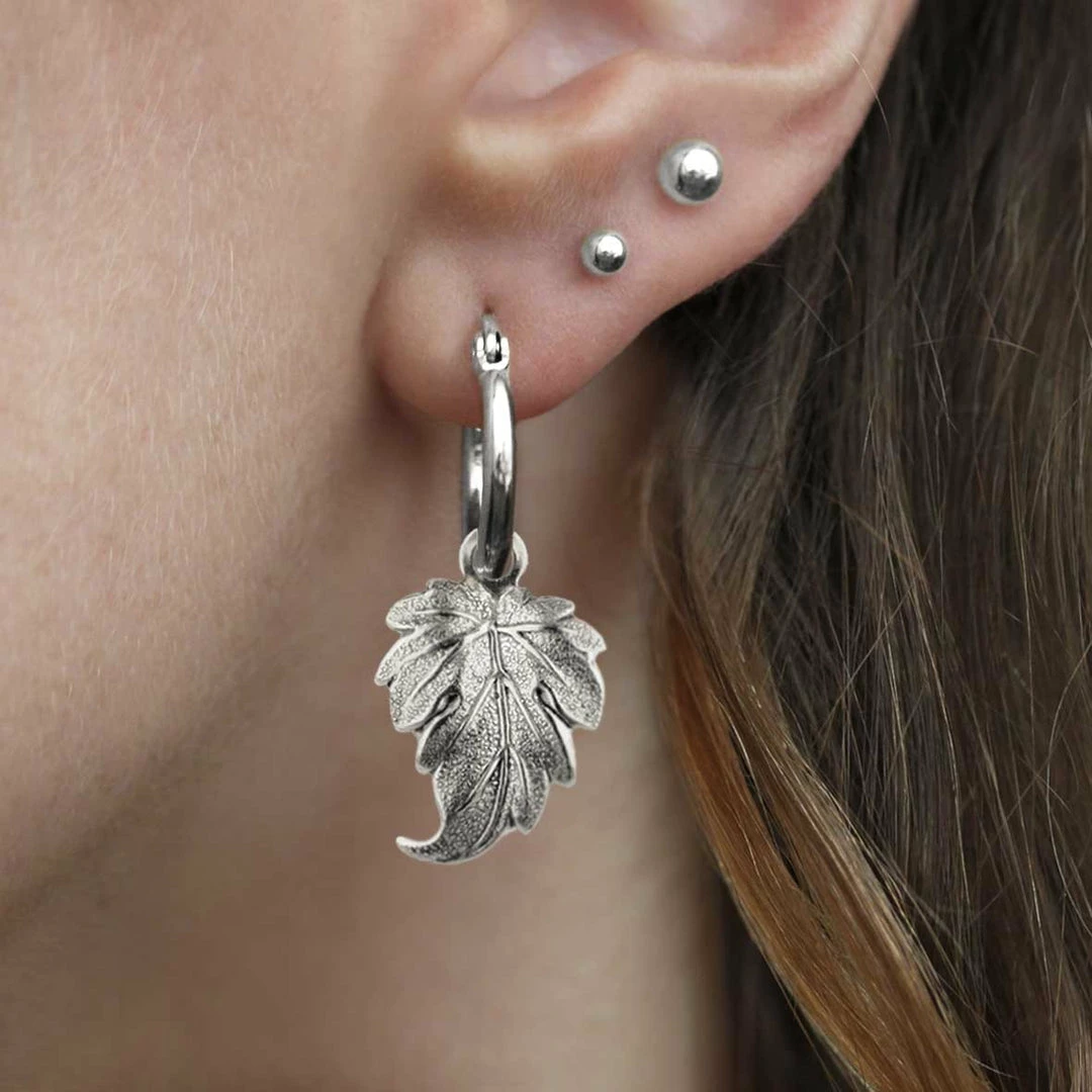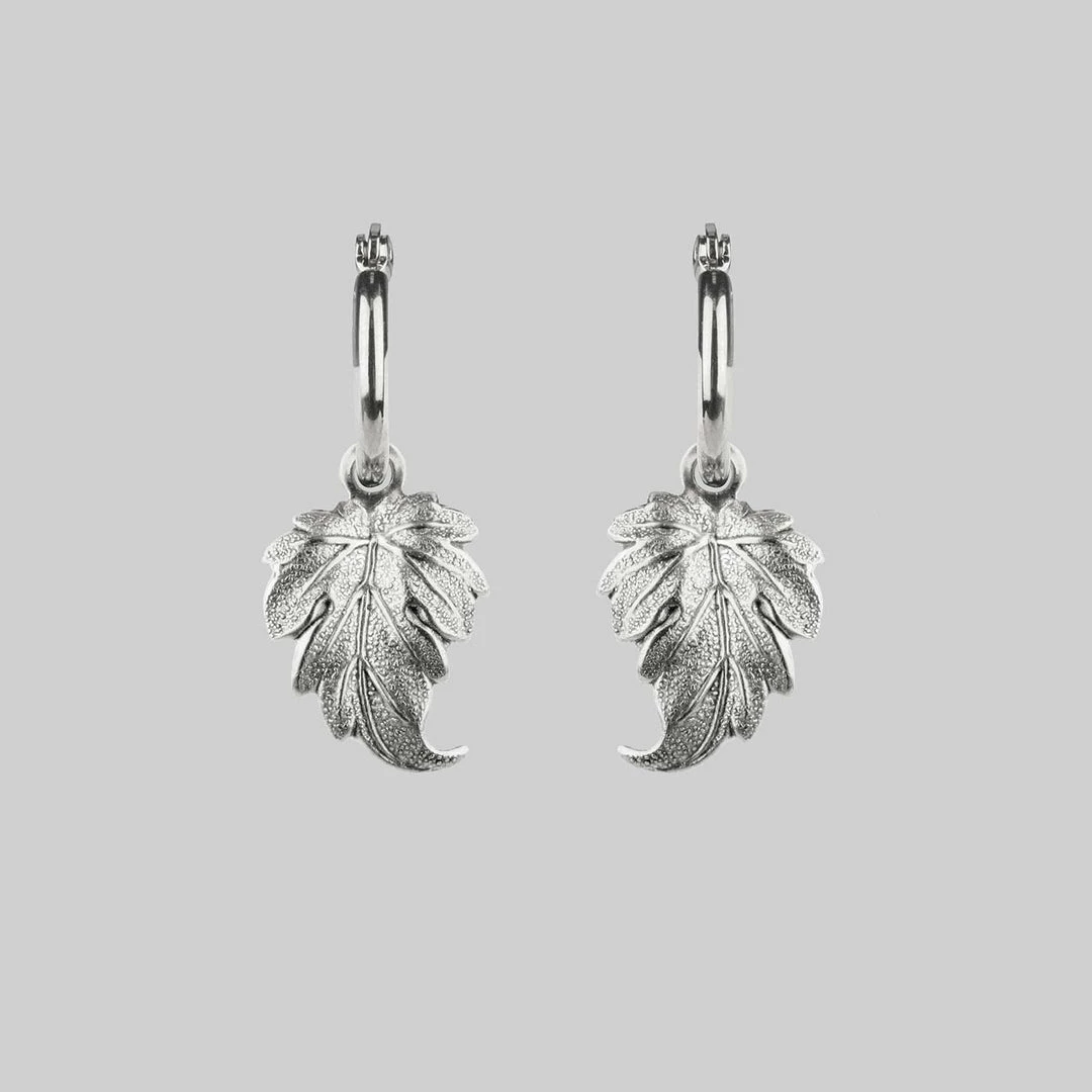Delicate and detailed leaf drop hoop earrings.