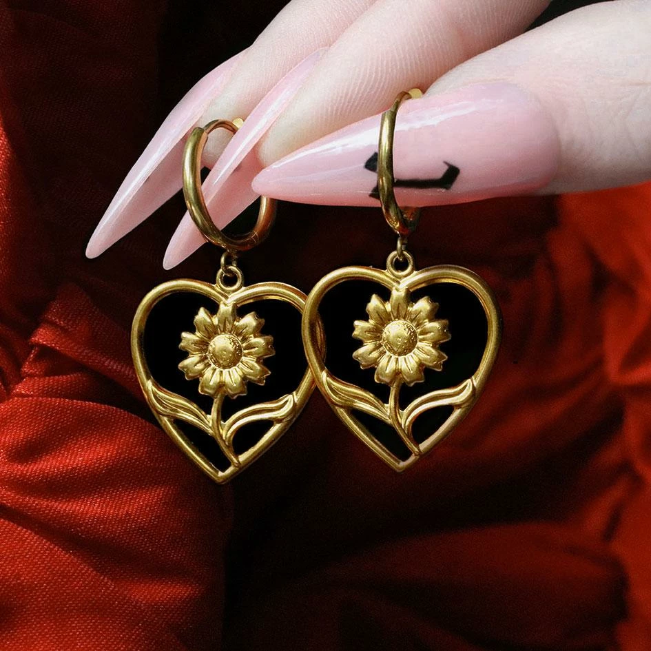 Angelic heart framed sunflower hoop earrings.