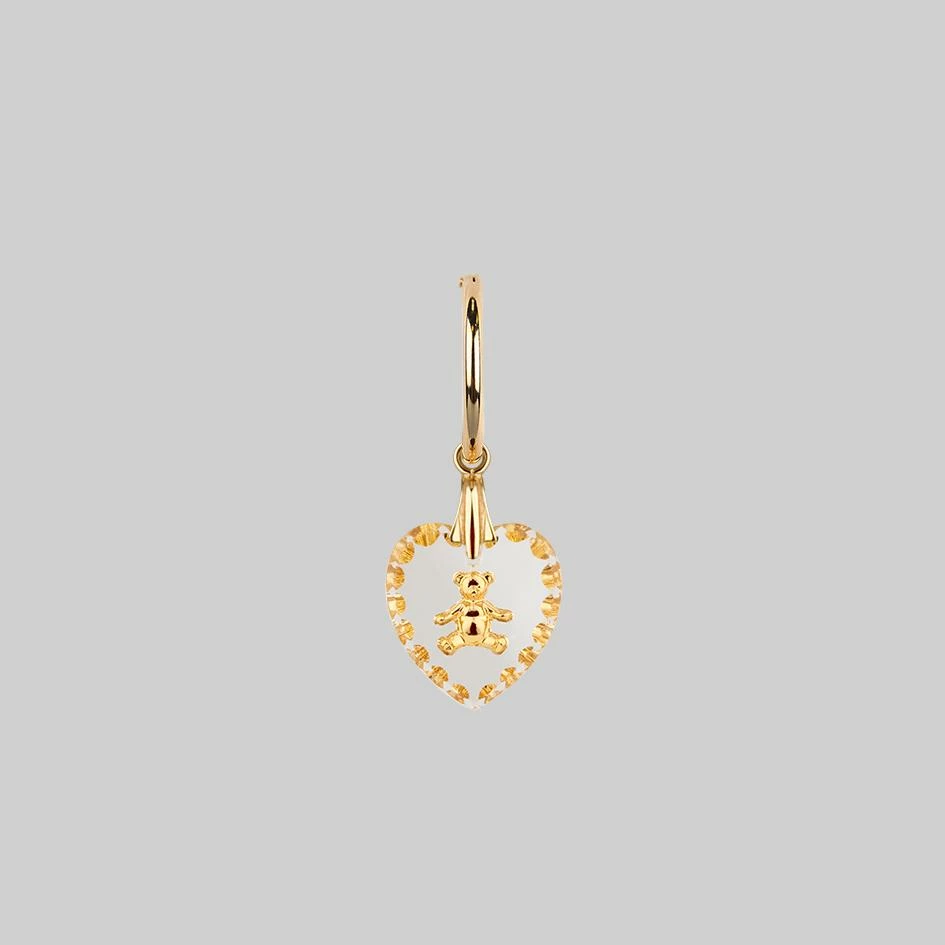 Vintage inspired scalloped edge glass heart Intaglios with adorable intricately engraved teddy bears hang from delicate sleeper hoop earring(s).