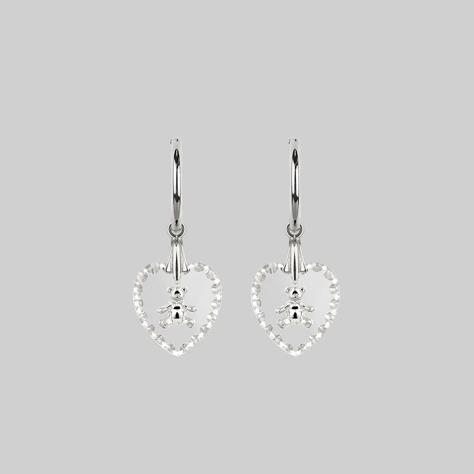 Vintage inspired scalloped edge glass heart Intaglios with adorable intricately engraved teddy bears hang from delicate sleeper hoop earring(s).