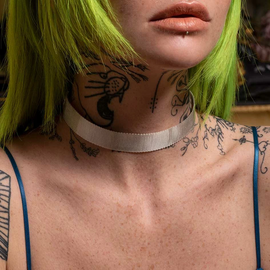 Wide metal mesh detail choker in silver.
