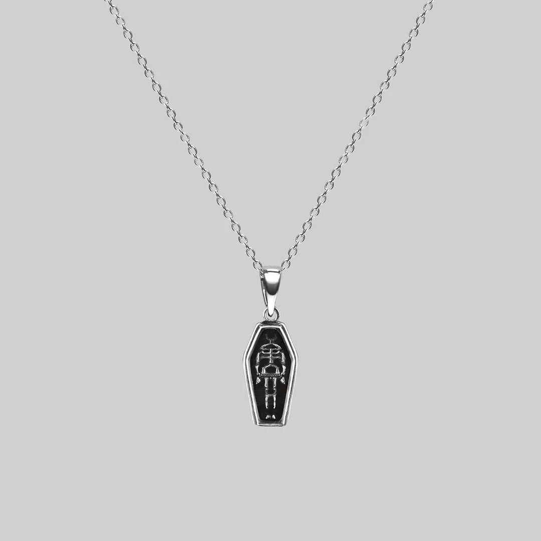 Coffin necklace encapsulating a tiny skeleton. Inspired by Mourning jewellery worn to express the sentiment of death.
