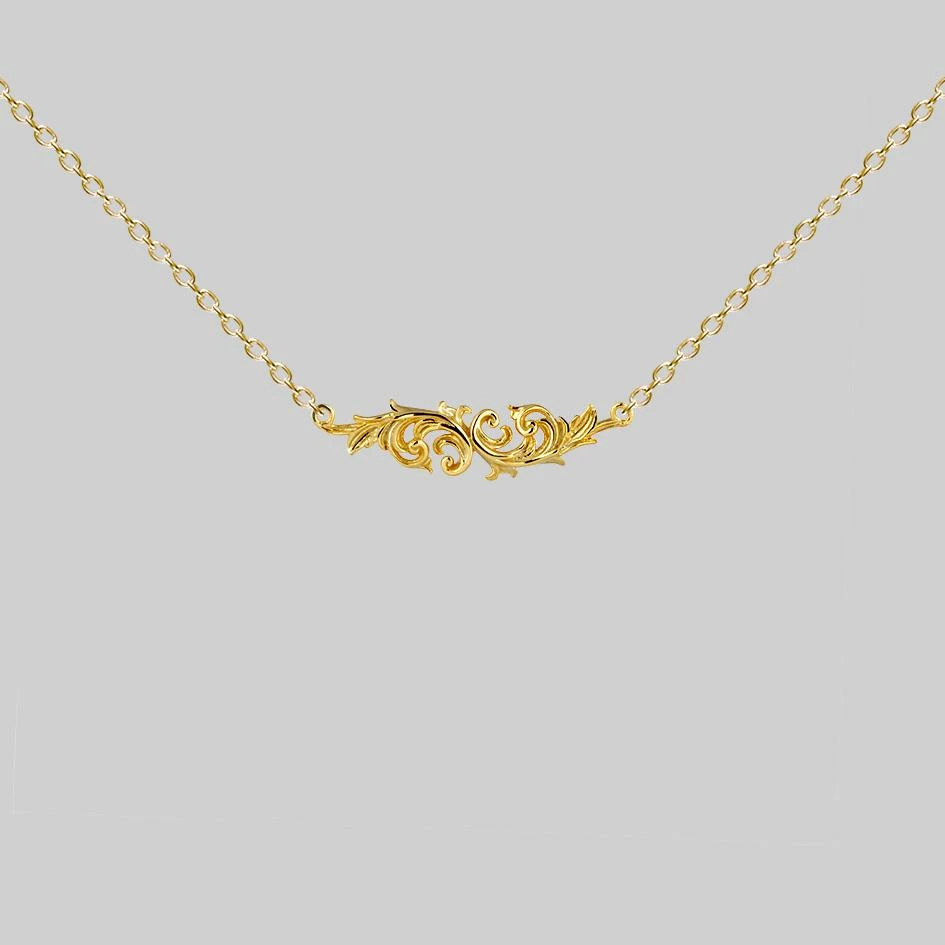Delicate ornate scroll detailed Gold necklace.