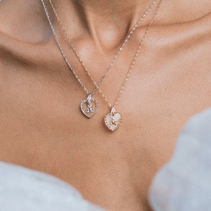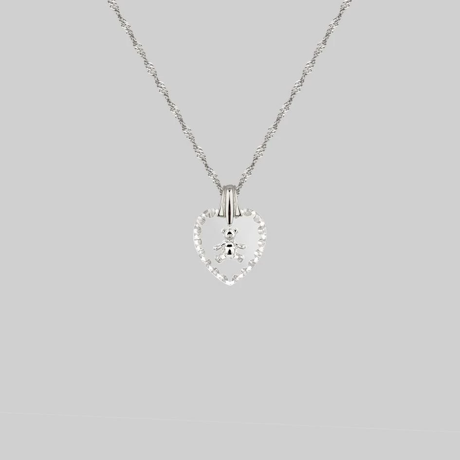 Exquisite scalloped edge glass heart Intaglio with adorable intricately engraved teddy bear hangs from a delicate Singapore style chain.