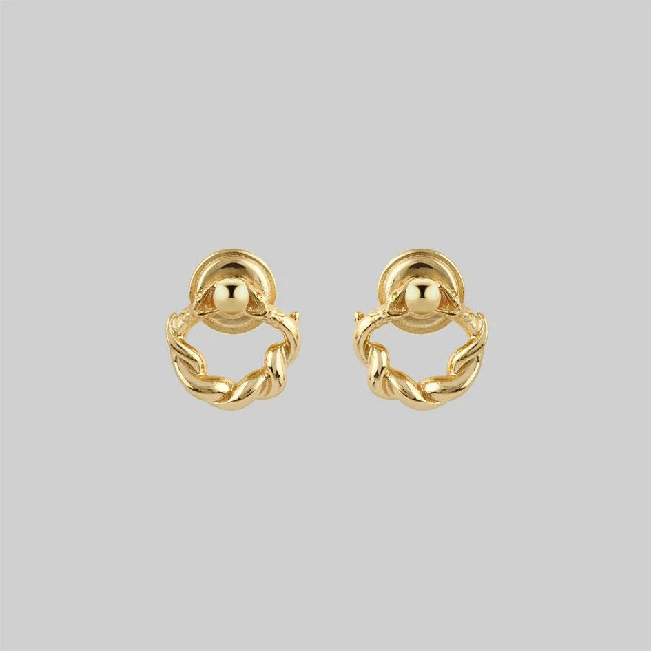 Ornate door knocker style stud Gold earrings featuring a pair of twisted snakes.