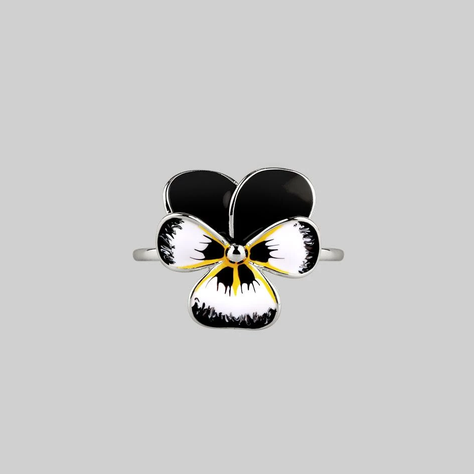 Silver ring featuring a delicate and detailed black pansy. Hand painted and finished with a layer of enamel to secure colour and detail.