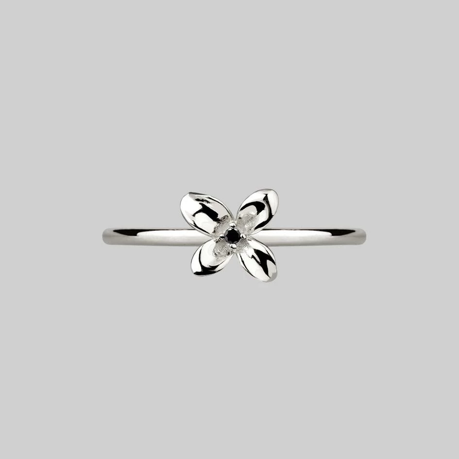 Silver ring featuring a delicate Clematis flower with a tiny Black Spinel gemstone centre.
