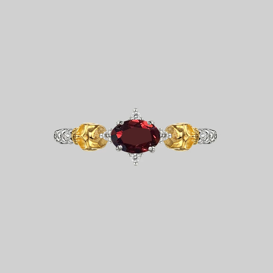 Deadly romantic little Skulls and Garnet gemstone ring featuring sparkling Cubic Zirconia setting details.
