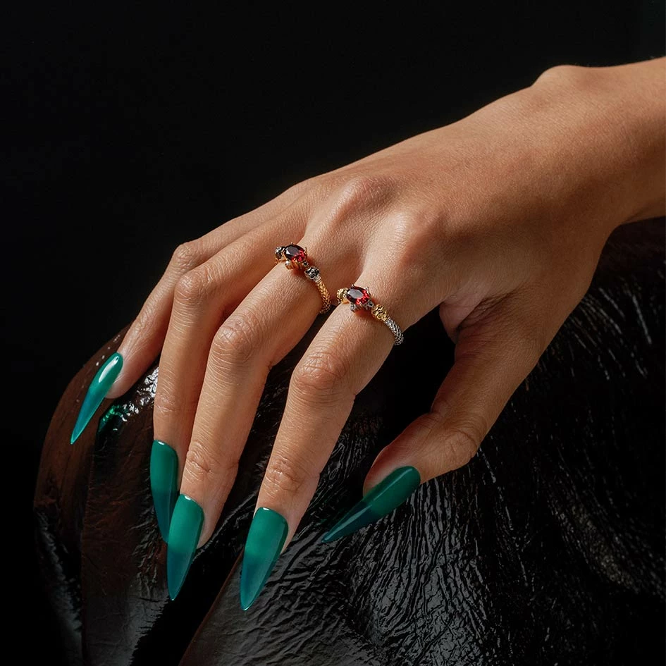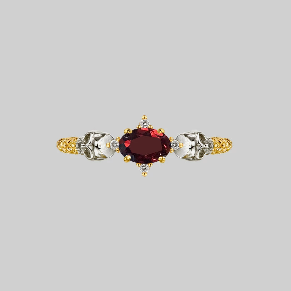 Deadly romantic little Skulls and Garnet gemstone ring featuring sparkling Cubic Zirconia setting details.