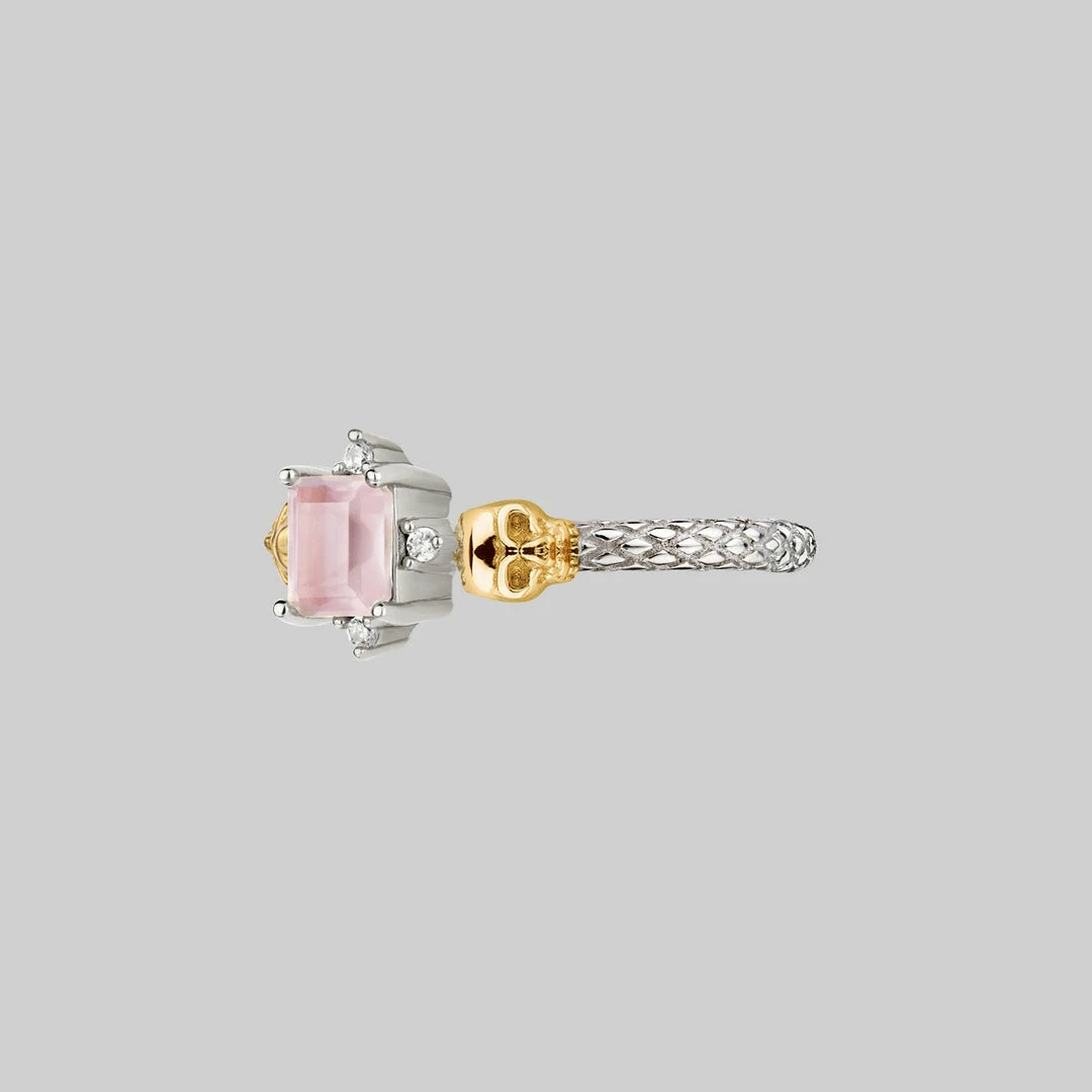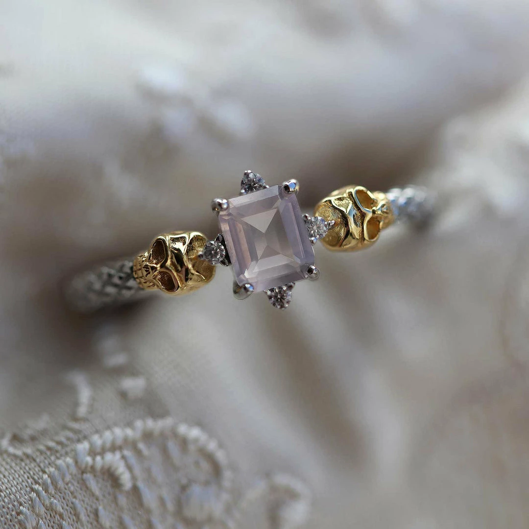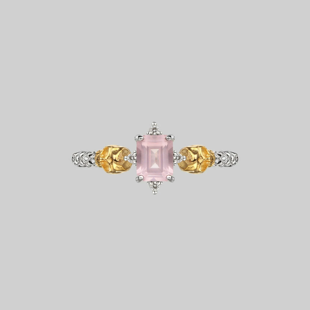 Deadly romantic little Skulls and Rose Quartz gemstone ring featuring sparkling Cubic Zirconia setting details.